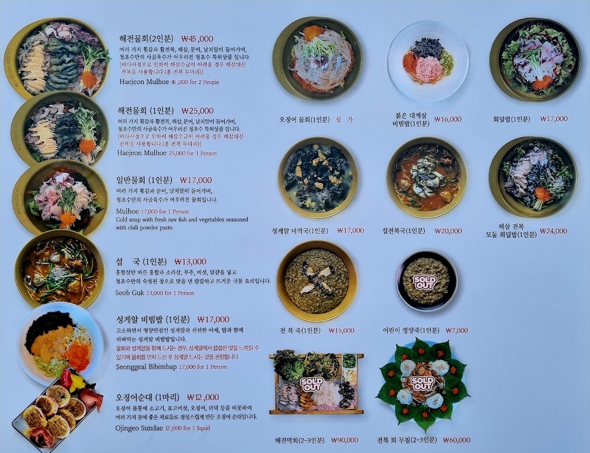 Welcome to Chungchosoo Mulhoe in Sokcho-si, where the ocean’s bounty meets culinary artistry. This renowned eatery specializes in 물회 (cold raw fish soup), a must-try local delicacy.