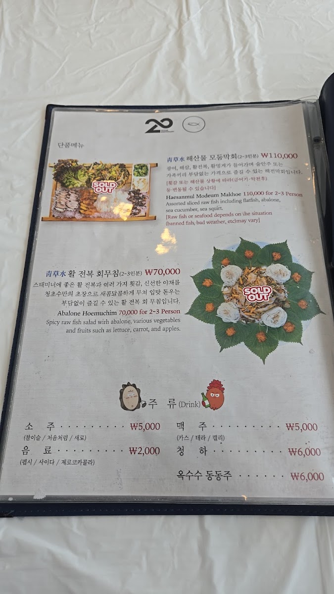 The standout dish, 청초수 물회, offers an exquisite blend of fresh seafood, including various fish, sea cucumbers, and the unique addition of 멍게 and 문어, all bathed in Chungchosoo's signature rich bone broth for ₩19,000. For those sharing, the 해전물회 elevates the experience with live abalone and sea cucumber, perfect for two at ₩48,000.